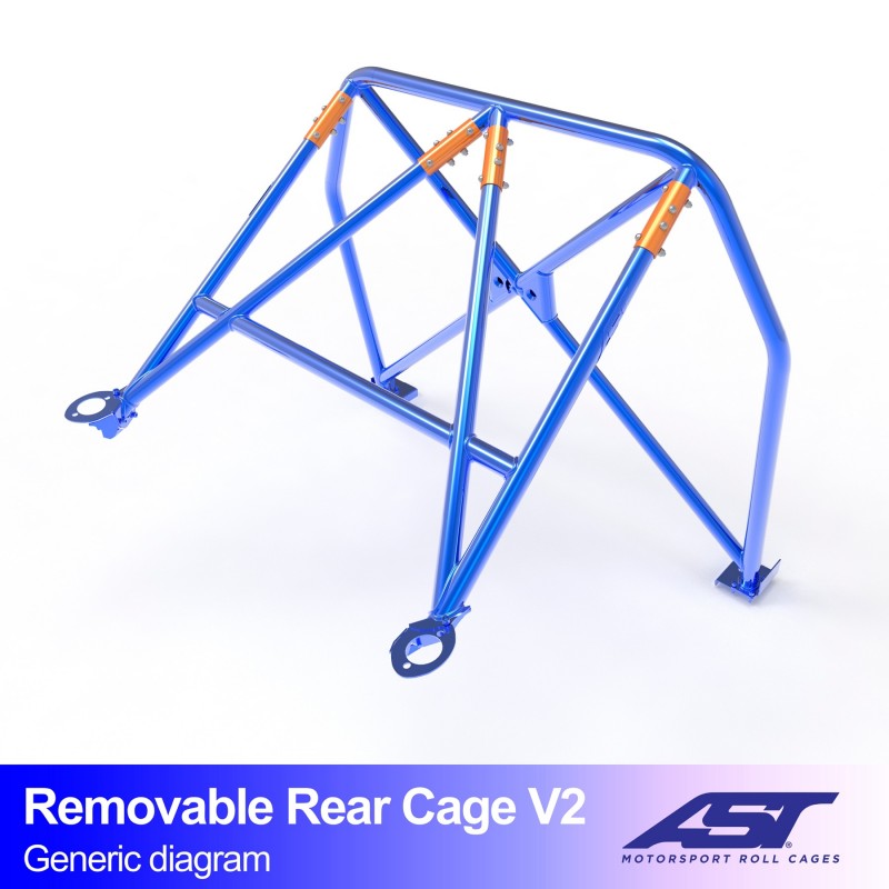 Half roll cage AST Removable Rear Cage V2 with 4 points to the bodyshell, screwed onto 4 reinforcement plates welded to the bodyshell. These reinforcement plates are made of 3mm thick steel and are designed and manufactured specifically for each car, achieving maximum safety and fitting on the chassis. The roll cage is delivered welded and unpainted, and consists of a main hoop of 45mm diameter in E355 steel, the rest of the structure is made of 40mm diameter in E355 steel. The structure is divided in multiple sections in order to allow an easier assembly in the vehicle