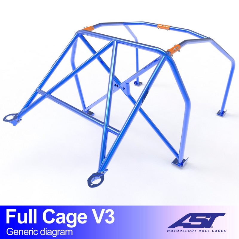 Arco de seguridad AST Full Cage V3 con 6 puntos de anclaje a la carrocería, atornillado sobre 6 bases soldadas a la carrocería. Estas bases son de acero de 3mm de espesor y están diseñadas y fabricadas específicamente para cada coche, consiguiendo una seguridad y una adaptación máximas sobre el chasis. La estructura de seguridad se entrega soldada y sin pintar. Arco principal fabricado en acero E355 con un diámetro de 45mm, el resto de la estructura está fabricada en acero E355 con un diámetro de 40mm. La estructura va separada mediante casquillos de unión en varias partes para poder introducirla dentro del vehículo.